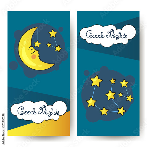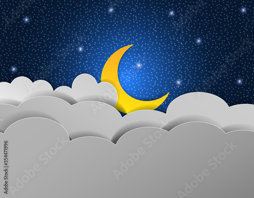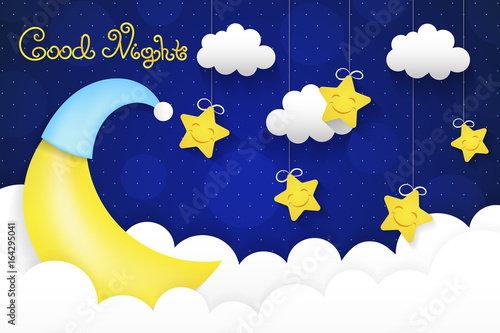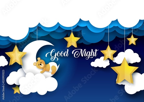 Vector layered paper cut style cute teddy bear sleeping on crescent moon, good night lettering. Creative beautiful sweet dreams composition for card, banner, flyer, poster etc.