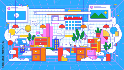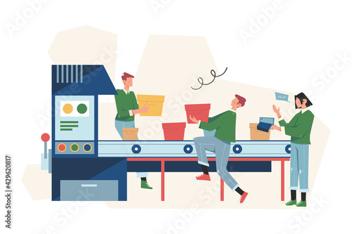 Vector illustration of confectioners rolling the dough, putting dough into oven, decorating ready cake. Waiter getting big cake with three tiers to serve it to customer. Pastry store flat style design
