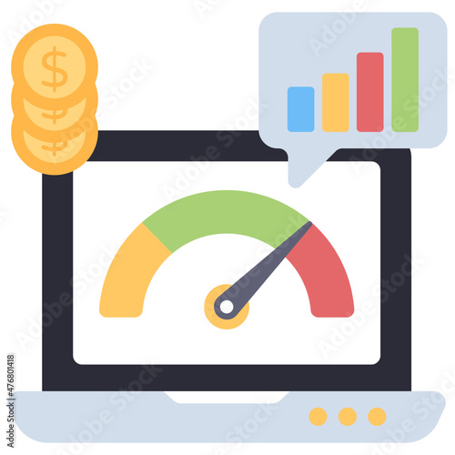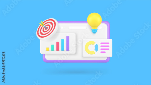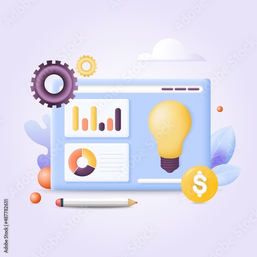 Tablet with charts and idea lamp on screen, flat vector illustration. Business idea, innovation.