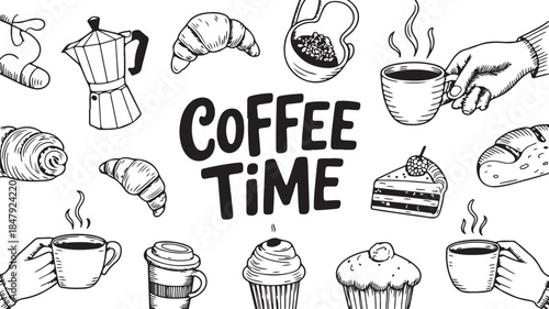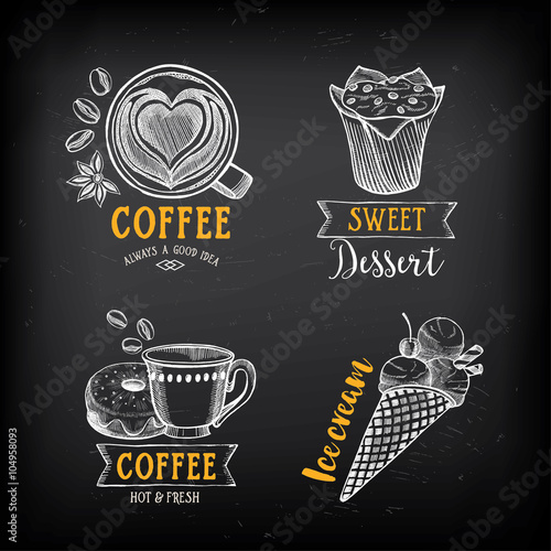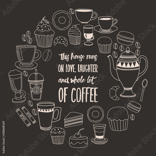 Vector realistic disposable coffee cup with doodle sweets, coffee drinks, business symbols, coffee quotes on chalkboard background. Sketch vintage take away coffee poster, banner template.