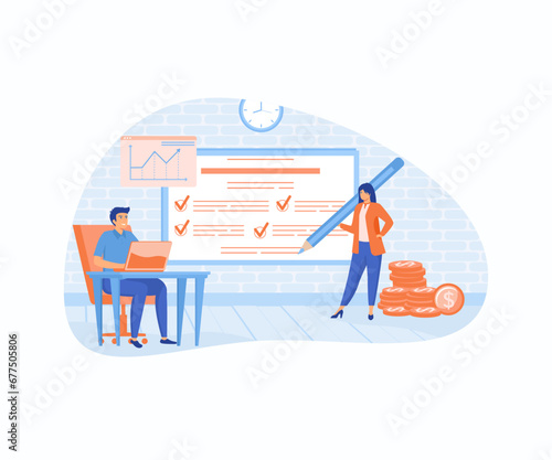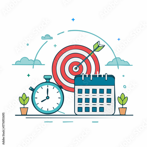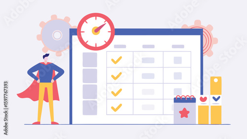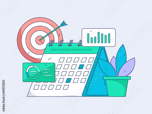 Target, calendar, to do list with check marks and businessman showing ok hand sign, flat vector illustration. Time management, planning, scheduling.