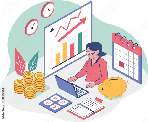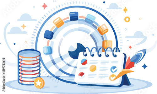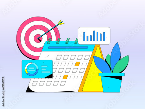 Target, calendar, to do list with check marks and businessman showing ok hand sign, flat vector illustration. Time management, planning, scheduling.