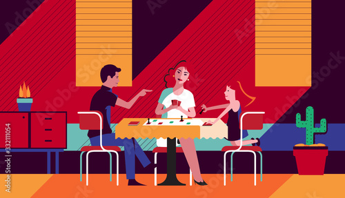 Vector illustration of professional tattoo artist making tattoo, client choosing tattoo sketch. Tattoo parlor concept flat style design elements.
