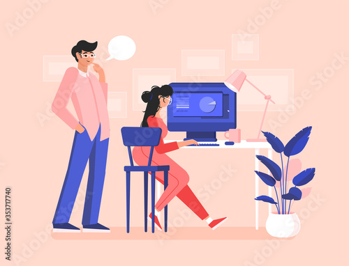 Professional tattoo artist master making tattoo with machine and inks, vector flat illustration. Tattooing art. Tattoo shop, studio and parlour services.