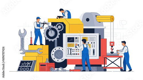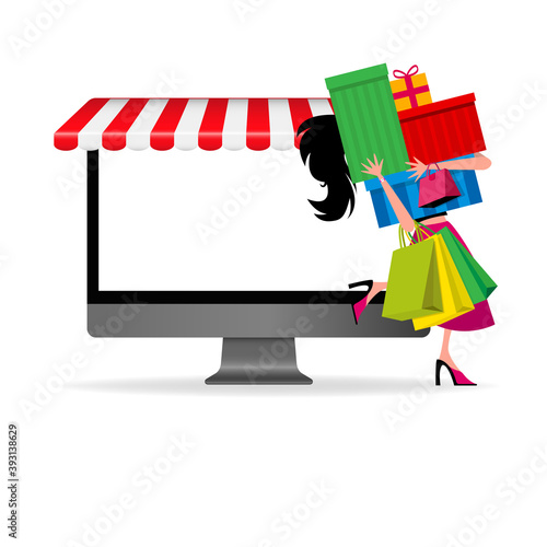 Huge laptop computer internet store and male and female characters doing tax free shopping online, vector illustration. VAT refund concept for web banner, website page etc.