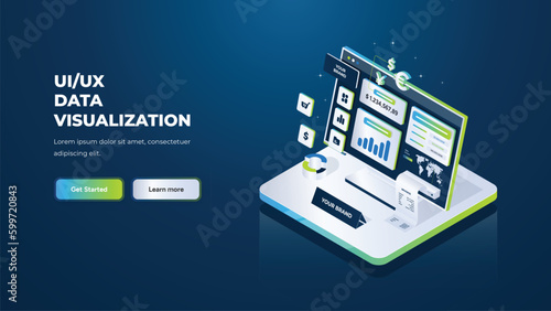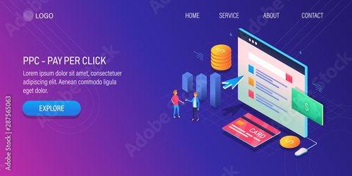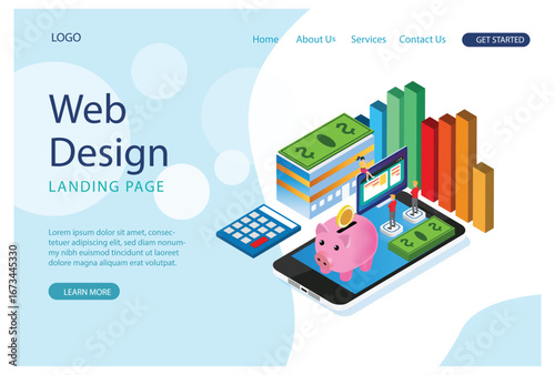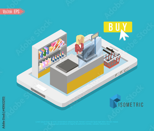 Applications for taxi services banner, web template. Vector isometric smartphone with cityscape, yellow taxi cab and map marker on screen, copy space, read more button.