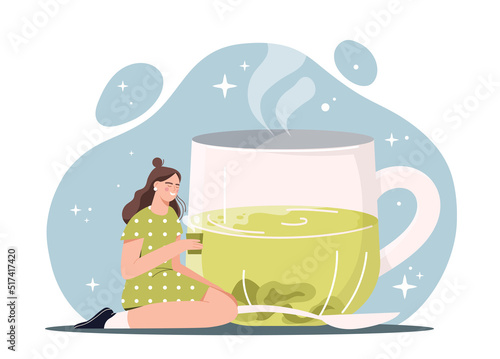 Huge teapot, micro male and female characters preparing tasty hot tea with lemon and cupcake, vector flat style design illustration. Teahouse, cafe, tea party composition.