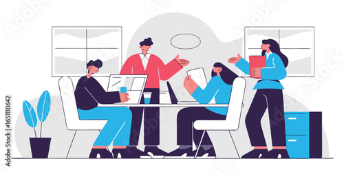 Tea typography banner template, flat vector illustration. People, male and female characters drinking tea sitting on big letters, talking to each other. Tea shop, teahouse.