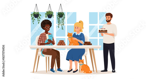 Team of business people sitting at desk with laptop and working in office together. Business meeting and teamwork concept vector illustration. Team work, office people, employee character.