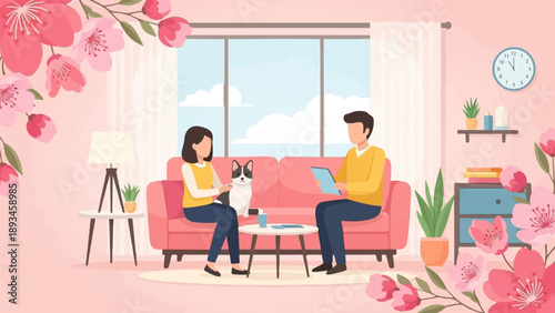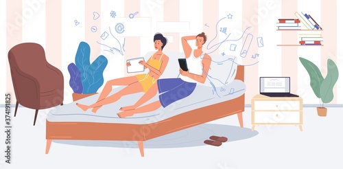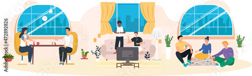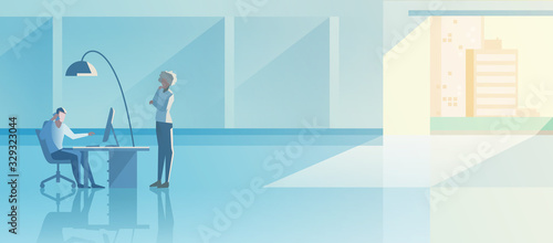 Team of tailor master taking measure of pretty bride for elegant wedding dress vector illustration. Process of sewing traditional garment for marriage in professional workshop atelier studio