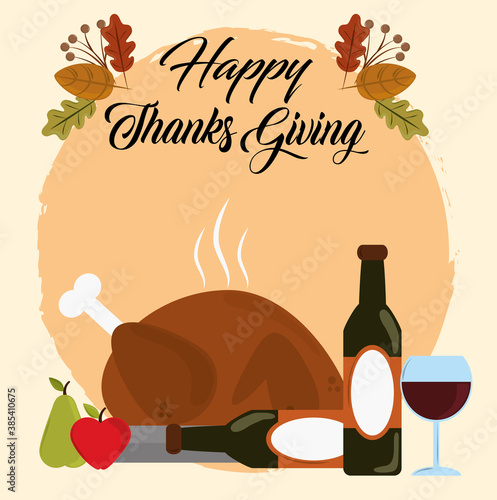 Thanksgiving Day vector flat illustration. Traditional roasted turkey, wine, maple leaves, acorns, cornucopia with pumpkin, corn cobs, apple. Happy Thanksgiving Day concept for web banner website page