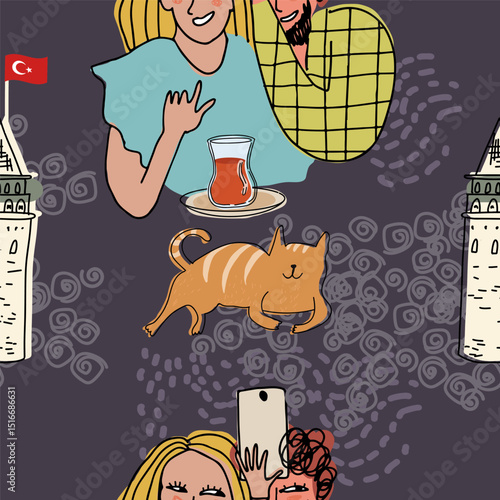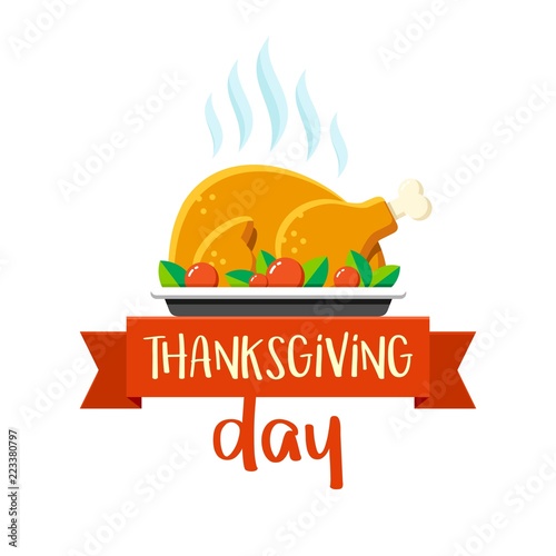 Thanksgiving Day vector flat illustration. Traditional roasted turkey, red wine, acorns, pumpkin, candles and calendar. Happy Thanksgiving Day celebration concept for web banner, website page etc.