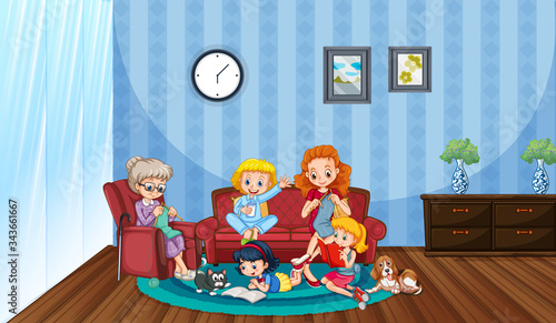 Theatrical performance. Group of actors performing on stage for audience, flat vector illustration. Theater interior with red curtains, spotlights. Comedy or drama. Entertainment. Theatre arts.