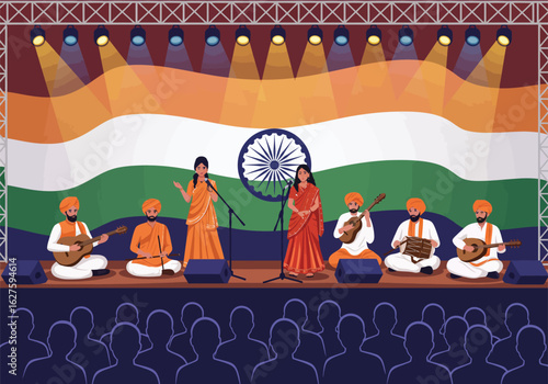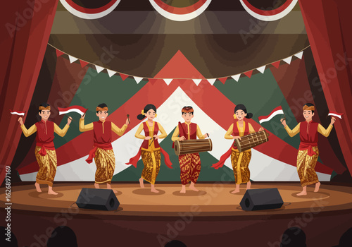 Theatrical performance. Group of actors performing on stage for audience, flat vector illustration. Theater interior with red curtains, spotlights. Comedy or drama. Entertainment. Theatre arts.
