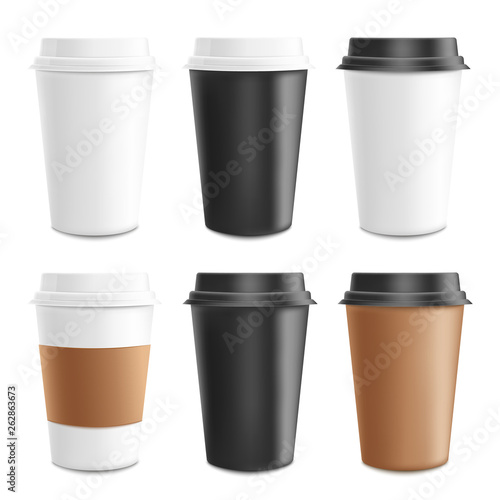 Thermo cup travel mug mock-up set. Vector realistic illustration isolated on white background.