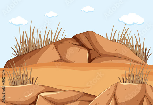 Three camels roaming desert, vector illustration in paper art style. Sand dunes, desert landscape.