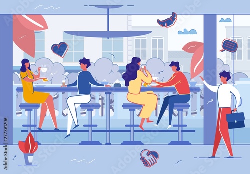 Three girls taking selfie in a bar. Female friends meet at a table in restaurant. Vector web site design template. Landing page website concept illustration.