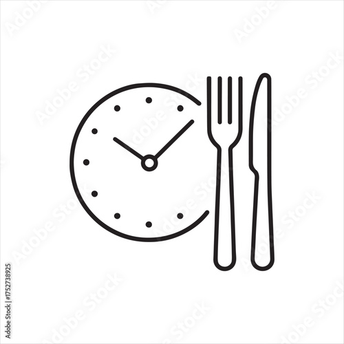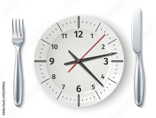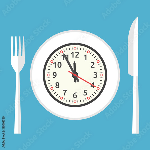 Time to have lunch vector poster, banner design template. Plate with clock, fork and knife, cup of coffee, top view illustration. Lunch time.