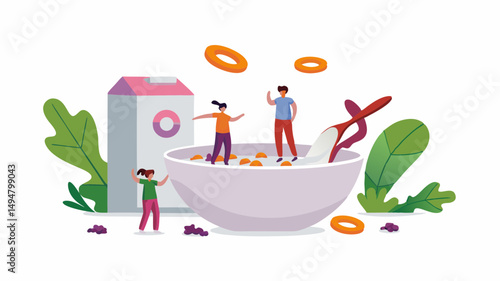 Tiny female cartoon characters preparing breakfast in the morning, flat vector illustration. Chefs cooking fried eggs, sausages and corn flakes with milk. Breakfast time. Restaurant, cafe services.