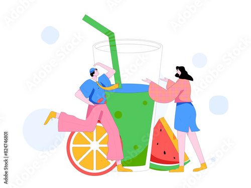 Tiny people making fruit cocktail, vector flat illustration. Summer fresh cold drink with berries, orange, mint leaves. Bartender preparing summer refreshing tasty and healthy beverage.