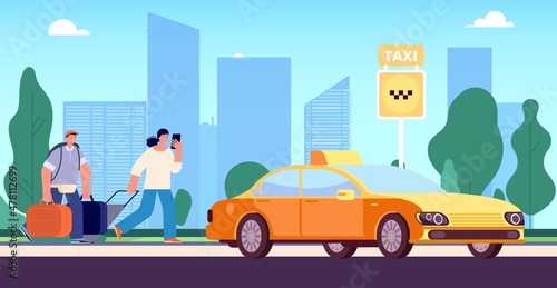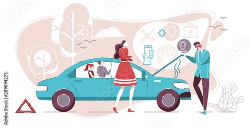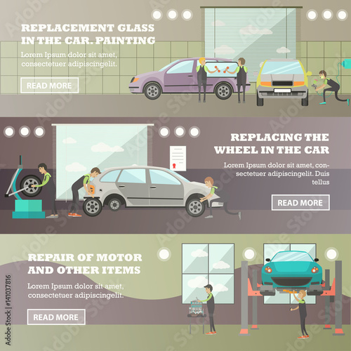 Tire change, auto service concept vector illustration. Workers changing auto wheel tires, flat style design elements.