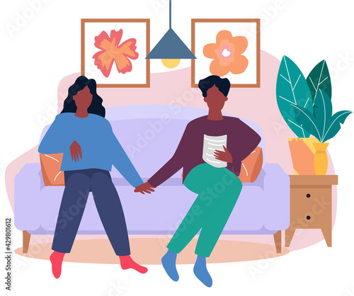 Tired stressed dad sitting in armchair while his son staying next to him with ball and book in hands, flat vector illustration. Parental stress concept.