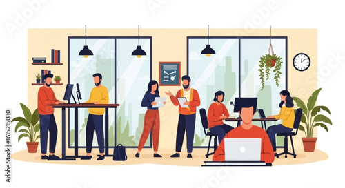 Tired human employee asking for help, robot machine working on computer tirelessly, flat vector illustration. Robots superiority, better quality and productivity. AI vs human intelligence.