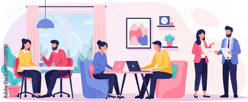 Tired human employee asking for help, robot machine working on computer tirelessly, flat vector illustration. Robots superiority, better quality and productivity. AI vs human intelligence.
