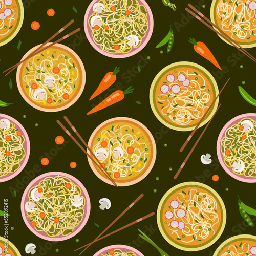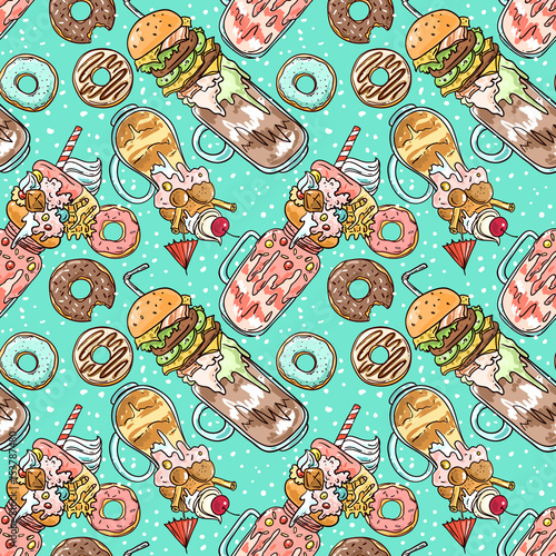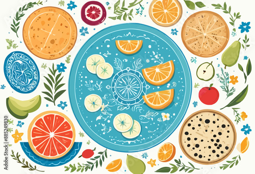 Top view table with mediterranean food seamless pattern. Vector hand drawn illustration. Healthy food, meals with fish, salad and vegetables.