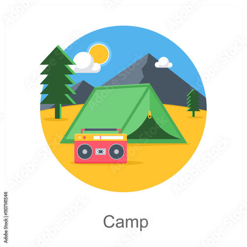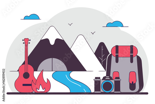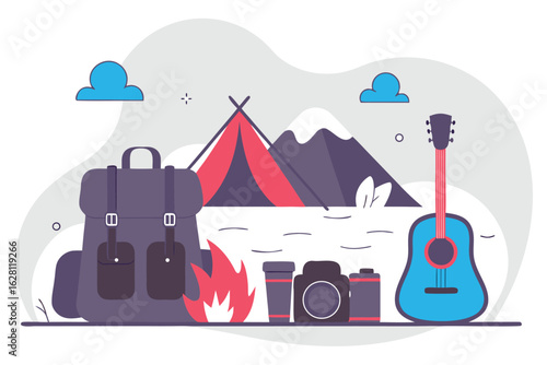 Tour agency advertising poster banner. Vector flat illustration. Mountain, kite, campfire, tent, backpack, dollar coin and charcoal lighter fluid bottle. Camping nature tourism concept.