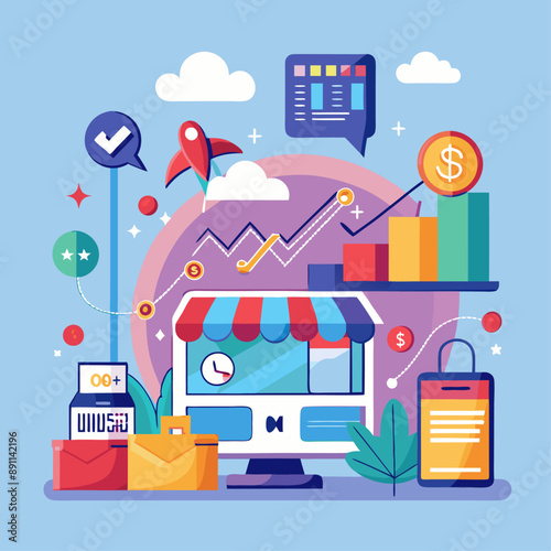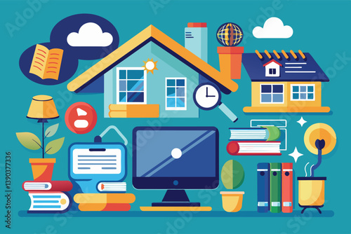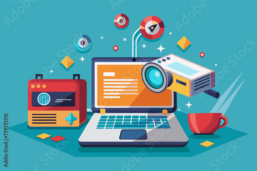 Tour agency poster banner. Vector flat illustration. Globe, smartphone, plane tickets, bag with passport money, laptop with world map location pin on screen, camera. Worldwide journey by air concept.