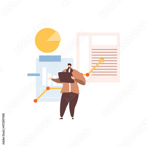 Vector illustration of travel agency worker female offering tours and trips for travelers. Tour operator flat style design element, icon isolated on white background.