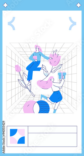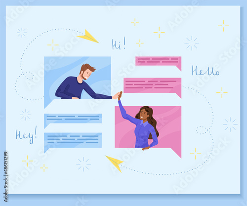 Tourists hiking in mountains. Outdoor travel and adventure concept. Man and woman climbing and trekking. Vector web site design template. Landing page website concept illustration.