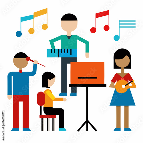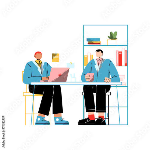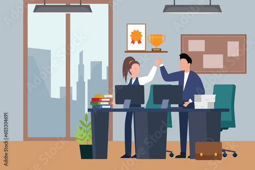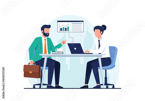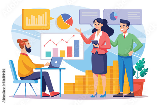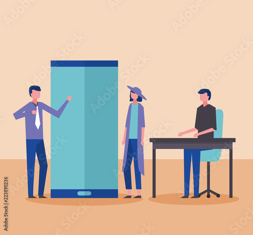 Trade show, fair, exhibition event scene, flat vector isometric illustration. Sales team professionals standing behind promo counters advertising company products to customer. Exhibition booth.