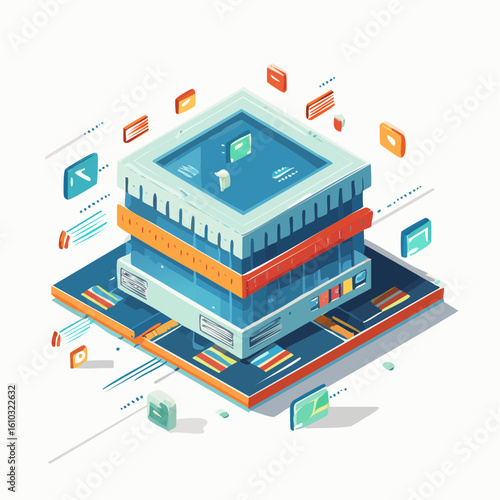Trailer online vector illustration. Isometric 3 d camper car or motor home for sale or rental on laptop keyboard. Online shopping, e-commerce concept design elements isolated on white background.