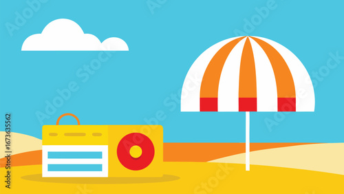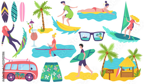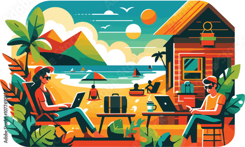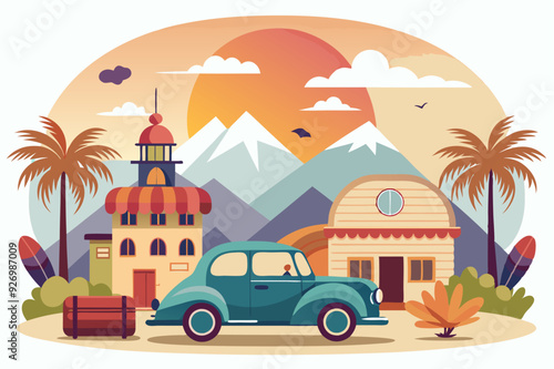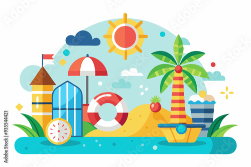 Travel concept vector illustration in flat style design. Airplane flying above tourists luggage, ship, palms, beach. Vacation and tourism background.