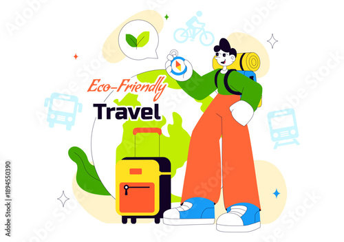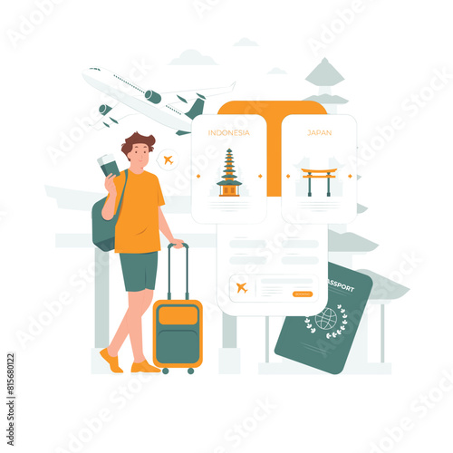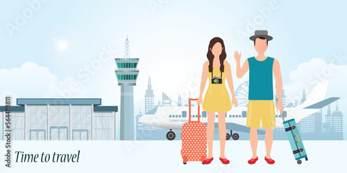 Travel couple back view, flat vector illustration. man and woman with traveling bag holding hands. Romantic vacation, summer holidays, honeymoon, world travel.