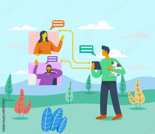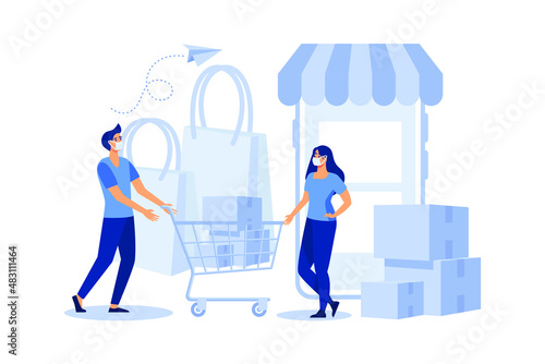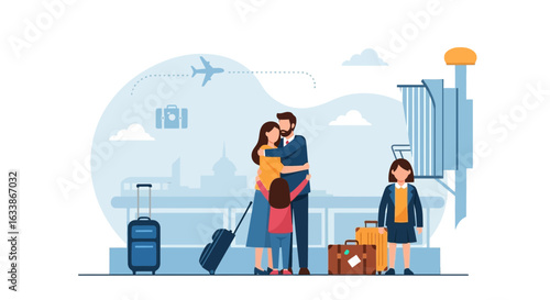 Travel couple back view, flat vector illustration. man and woman with traveling bag holding hands. Romantic vacation, summer holidays, honeymoon, world travel.