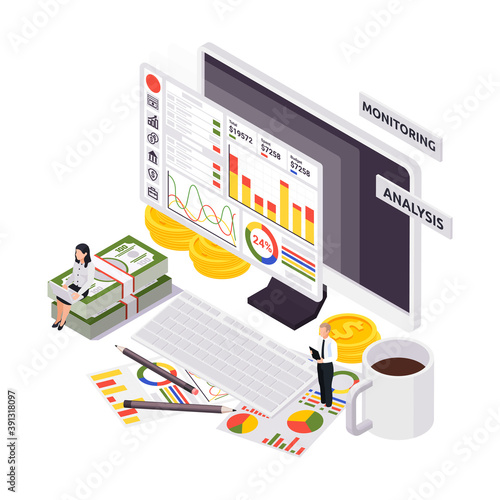 Travel insurance online, vector illustration. Smartphone with insurance policy, shield, suitcases, passenger liner, finger tapping buy button. Isometric composition for poster, banner, website page.
