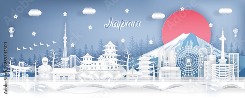Travel poster, banner template, vector illustration in paper art style. Hot air balloons flying over world famous landmark silhouettes. International tourism, time to travel concept.