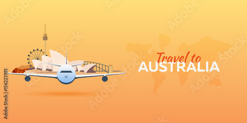 Travel poster, banner template, vector illustration in paper art style. Plane flying in sky and world famous landmark silhouettes. Worldwide tourism, flight tour, air travel.
