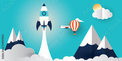 Travel poster template, vector illustration in paper art style. Hot air balloons flying over world famous landmarks silhouettes, copy space. Layered paper cut travel composition for web banner, page.