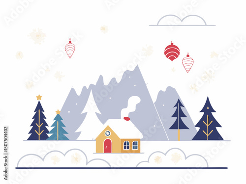 Travel tickets in box, decorated Christmas tree with balls, winter night forest landscape, vector illustration in paper art style. Christmas tour, winter vacation.