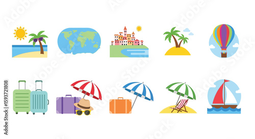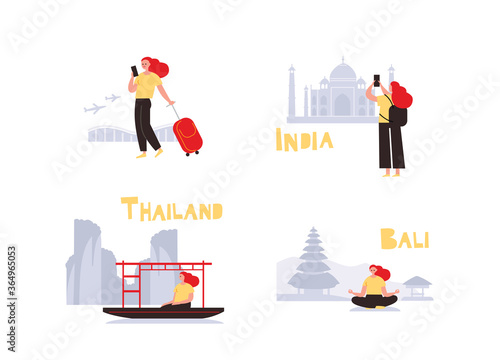 Traveler cartoon characters, flat vector isolated illustration. People traveling by plane, passenger and baggage screening procedures. Summer beach vacation. Yoga and meditation retreat. City travel.