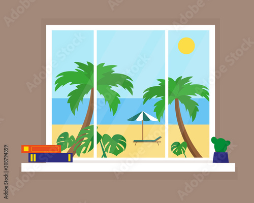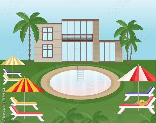 Vector illustration of woman sunbathing at resort swimming pool. Trip to Egypt concept flat style design element.