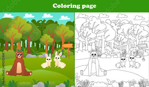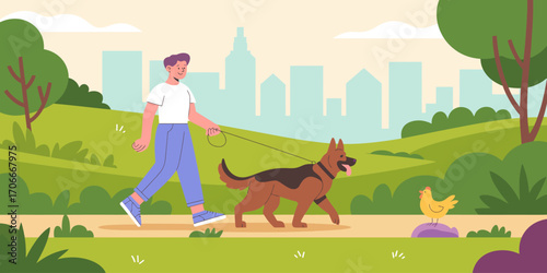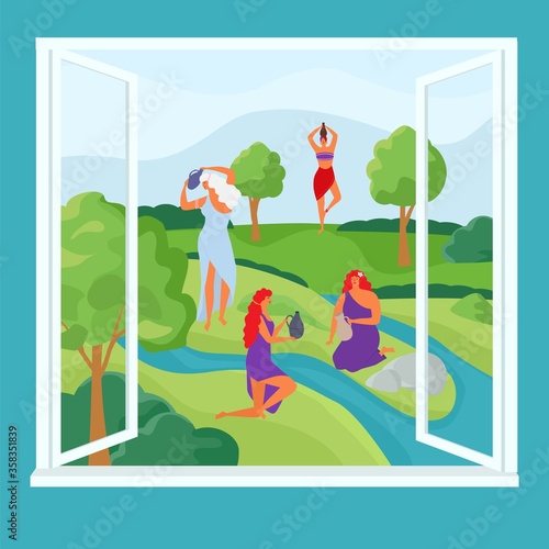 Trip to mountains poster, banner template. Happy woman sitting by campfire in forest, flat vector illustration. Summer vacation, hiking, camping. Explore nature, mountains, woods.