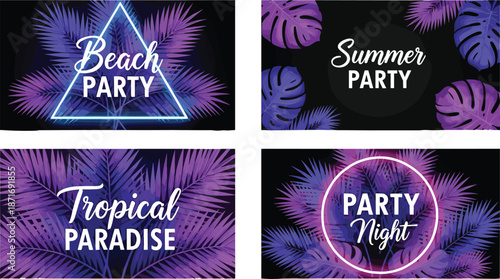 Tropical neon frame set with palm, monstera leaves, vector isolated illustration. Jungle leaves borders, neon light design.