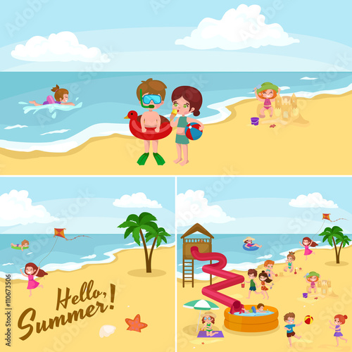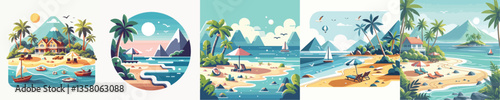 Tropical beach lifeguard at work flat vector. Tropical resort with people resting swimming in sea or ocean and lifesaver rescue team cartoon illustration. Tropical landscape, travel and vacation