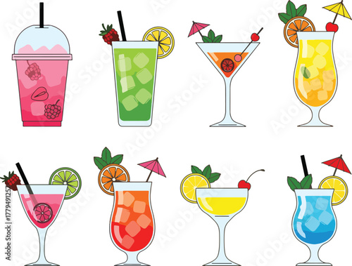 Tropical cocktail vector. Beach drink summer glass set. Alcohol fruit exotic beverage isolated on white background. Resort bar, seashore pub liquid appetizer menu assortment illustration