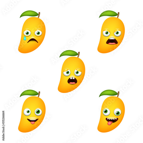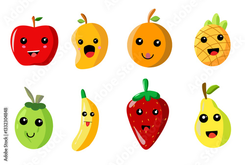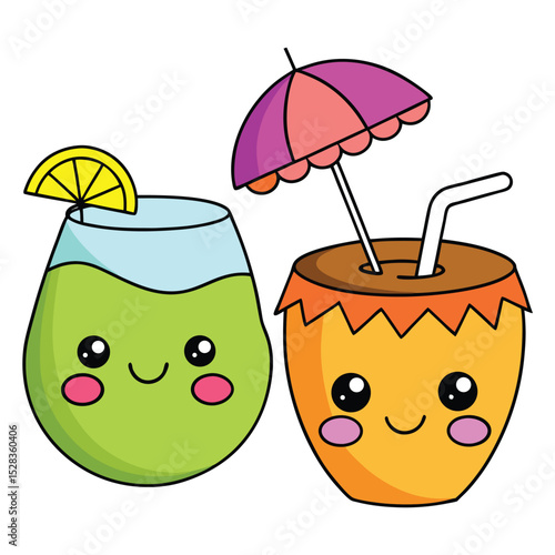 Tropical fruit cocktail cartoon face flat vector set. Kawaii cartoon character illustration. Exotic drink in glass with straw and piece of pineapple, orange and mint leaves isolated on white
